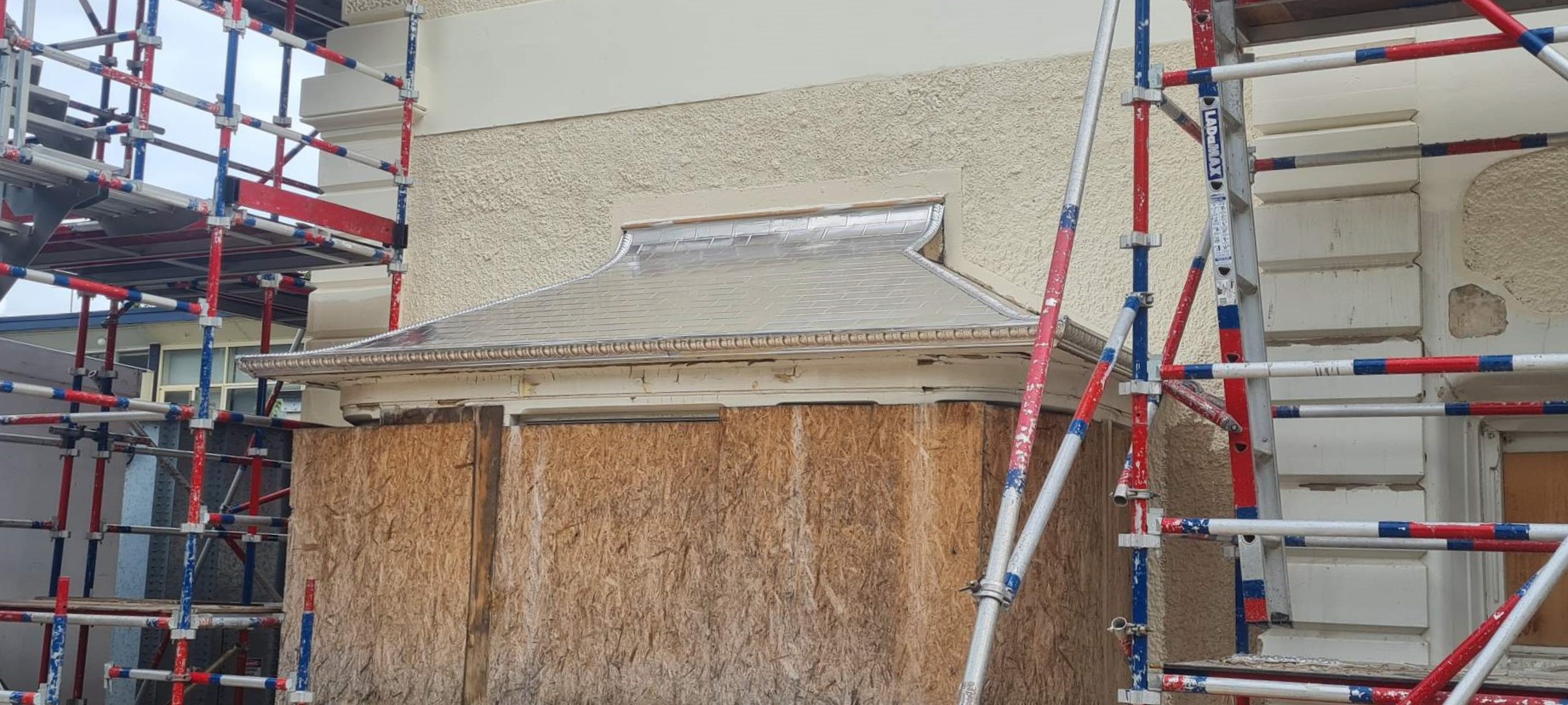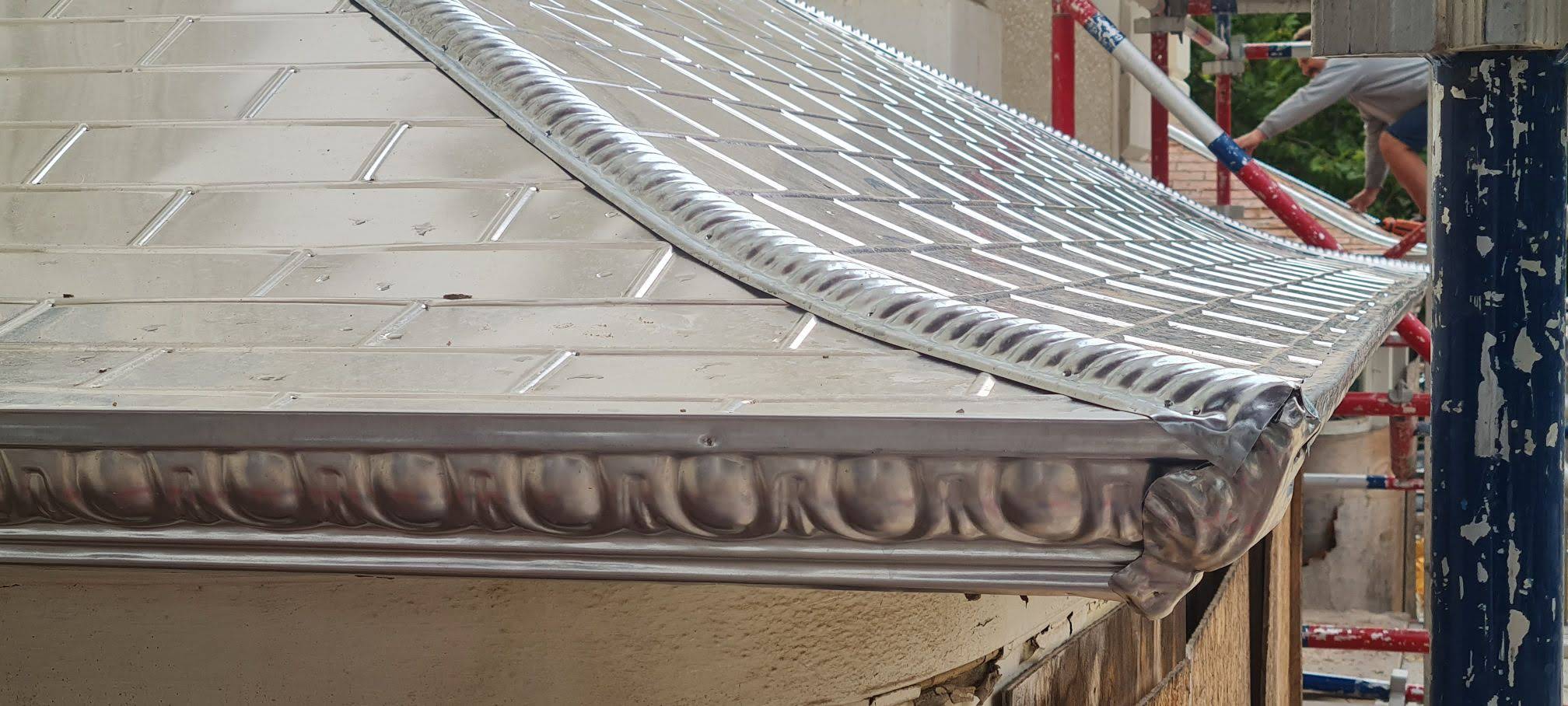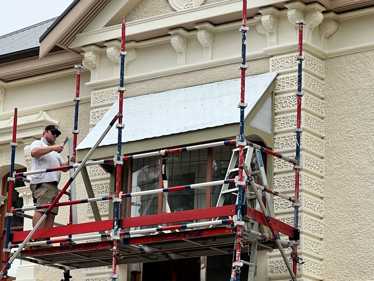 Project DescriptionAdelaide Pressed Metal worked closely with Builder Marshall & Brougham Constructions Pty. Ltd. on the restoration & replacement of pressed metal elements on heriage listed Davaar House originally built for wine & spirit merchant William Johnston in 1876. Works carried out by Adelaide Pressed Metal on the custom orb & canopy included reframing the awning & replacing the roof with pressed metal panels in Fishscale design to match the original & installing the orb base with pressed metal panels in Pebblecrete design replacing the original pebbledash. The decision was made to replace the original pebbledash, which is made up of a combination of wire, aggregate & plaster and is a heavy cladding, with Pebblecrete in aluminium pressed metal panels was due to the original framing being compromised over the years. The Pebblecrete pressed metal being a much lighter cladding would negate the need to rework the structural supports while giving the same asthetic. The two bay window roofs were also repaired & replaced like for like to match the original. The bay roof on the Eastern side was unpicked, patched, repaired & restored & the bay roof on the Western side was completely replaced due to irreparable damage due to weathering & lack of maintenance over the years. The rope batten detail along the ridge of each bay was pressed in soft zinc making it pliable to follow the curves of each roof and the Egg & Darte cornice in aluminium was used as a decorative fascia around each of the bay roofs to match the original.