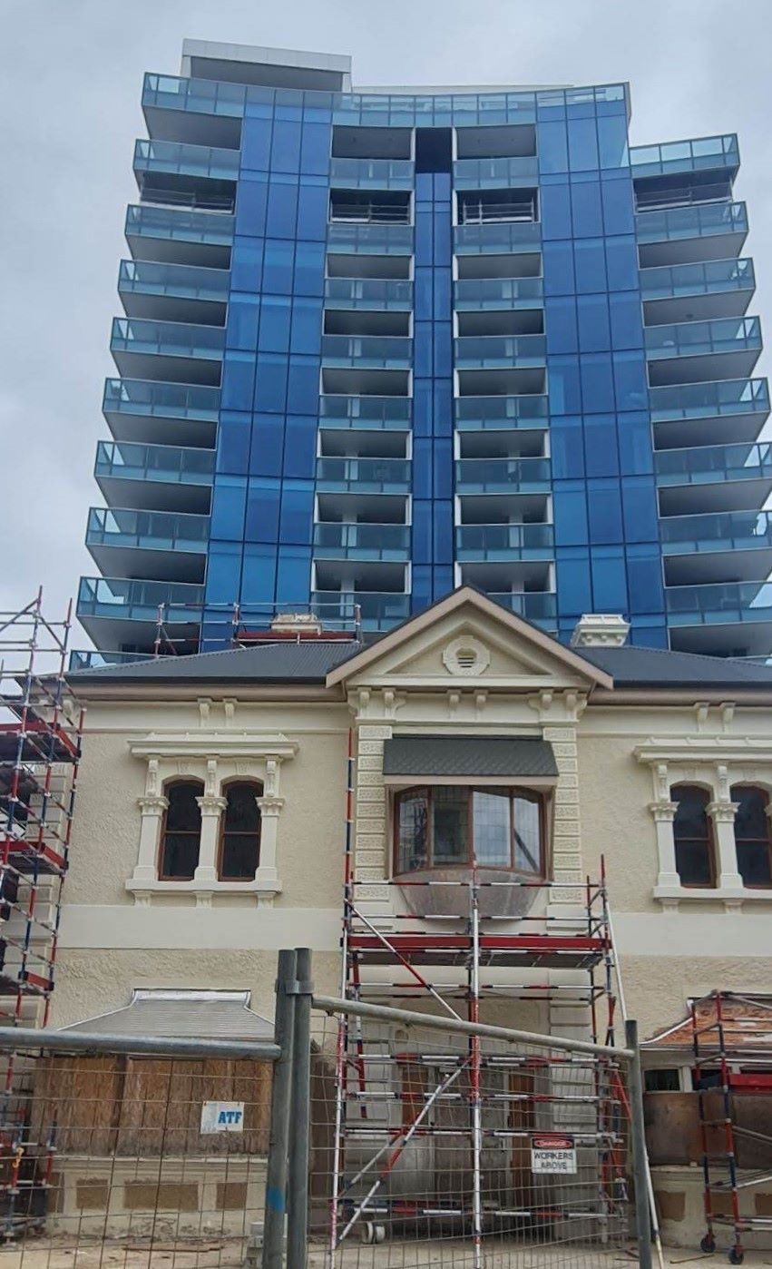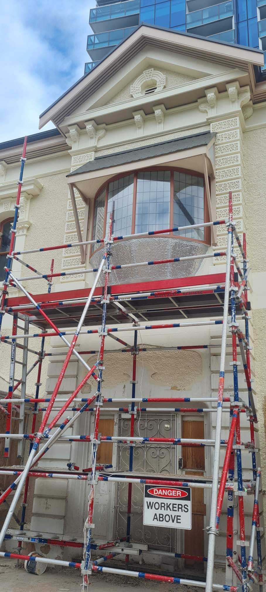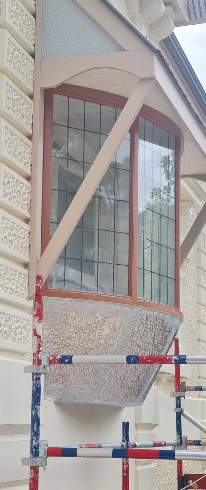 Project DescriptionAdelaide Pressed Metal worked closely with Builder Marshall & Brougham Constructions Pty. Ltd. on the restoration & replacement of pressed metal elements on heriage listed Davaar House originally built for wine & spirit merchant William Johnston in 1876. Works carried out by Adelaide Pressed Metal on the custom orb & canopy included reframing the awning & replacing the roof with pressed metal panels in Fishscale design to match the original & installing the orb base with pressed metal panels in Pebblecrete design replacing the original pebbledash. The decision was made to replace the original pebbledash, which is made up of a combination of wire, aggregate & plaster and is a heavy cladding, with Pebblecrete in aluminium pressed metal panels was due to the original framing being compromised over the years. The Pebblecrete pressed metal being a much lighter cladding would negate the need to rework the structural supports while giving the same asthetic. The two bay window roofs were also repaired & replaced like for like to match the original. The bay roof on the Eastern side was unpicked, patched, repaired & restored & the bay roof on the Western side was completely replaced due to irreparable damage due to weathering & lack of maintenance over the years. The rope batten detail along the ridge of each bay was pressed in soft zinc making it pliable to follow the curves of each roof and the Egg & Darte cornice in aluminium was used as a decorative fascia around each of the bay roofs to match the original.