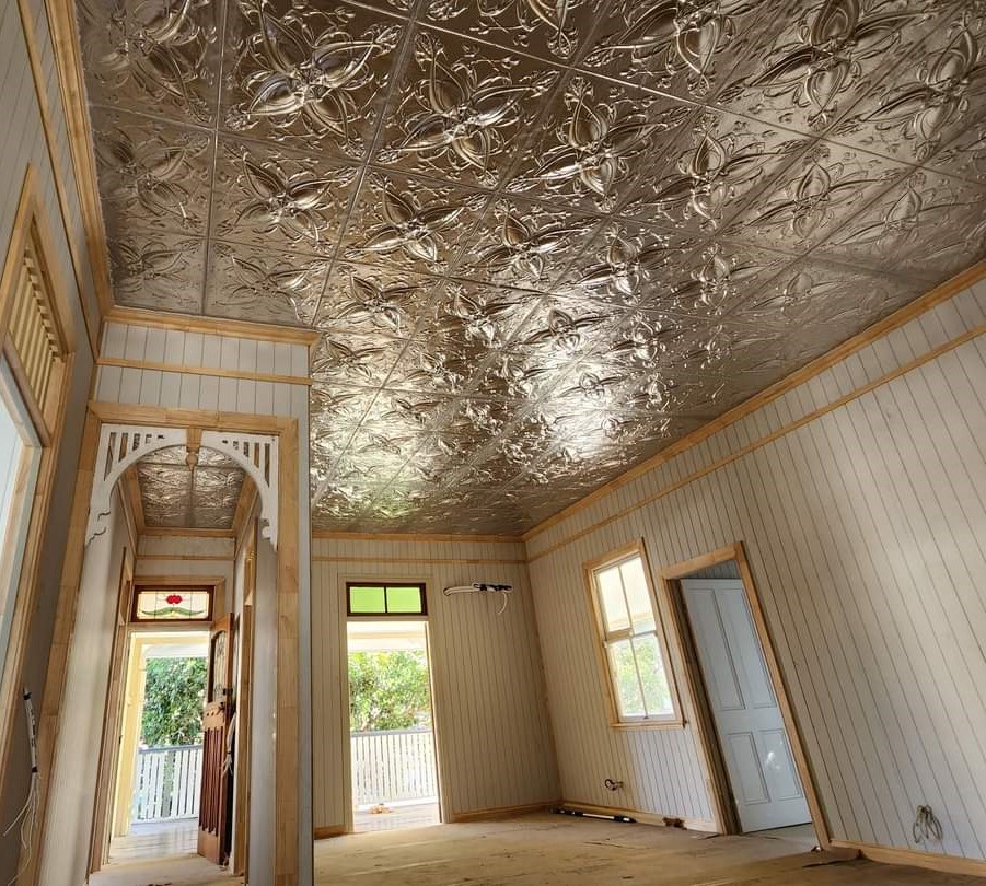 Project DescriptionThe ever elegant Elliston panel, so beautiful & the perfect choice for this stunning heritage Queenslander, enhancing the original charm. The suburb of Windsor in Brisbane was hit hard by the floods in 2022 and finally these home owners are seeing some restoration progress. Bisbane Pressed Metal supplied and installed the Elliston design in the lounge/dining, bedrooms & hallway completing with no more gapping ready for painting. Panels are in pattern repeats of 600mm x 600mm and are available in a panel size of 600mmx1800mm.