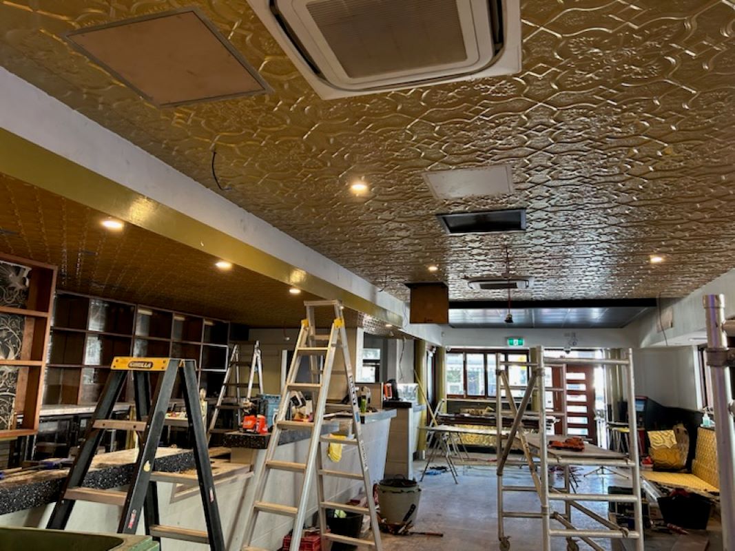 Project DescriptionWelcome to the new Royal George Hotel transformation. The Royal George Hotel is located on the corner of Ann & Brunswick Streets, Fortitude Valley, Brisbane. The original building dates back as far as 1850 with major additions & renovations in 1886 & 1924 transforming it into a grand late Victorian style building. Unfortunately in the 1960's much of the Victorian style decoration was stripped out & Brisbane Pressed Metal are proud to be a part of restoring some of the original grandeur this beautiful Heritage Listed Hotel deserves. Brisbane Pressed Metal have supplied & installed all pressed metal panels in Newington design, Lattice design & Carlton design to the main bar area & gaming room creating stunning decorative feature ceilings worthy of such a special building.