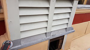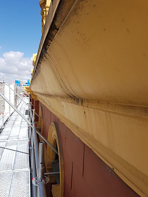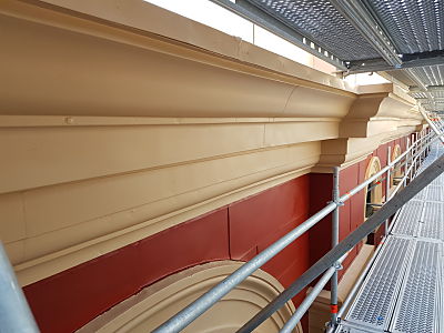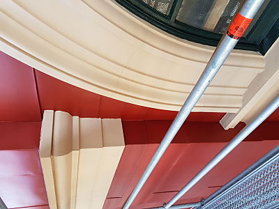 Scope of Contracting WorksExtensive repair and restoration of pressed metal elements including metal shingle cladding, 14 vent stacks repaired using soft zinc, installation of lead flashing, penetrations under verandah for rain heads.