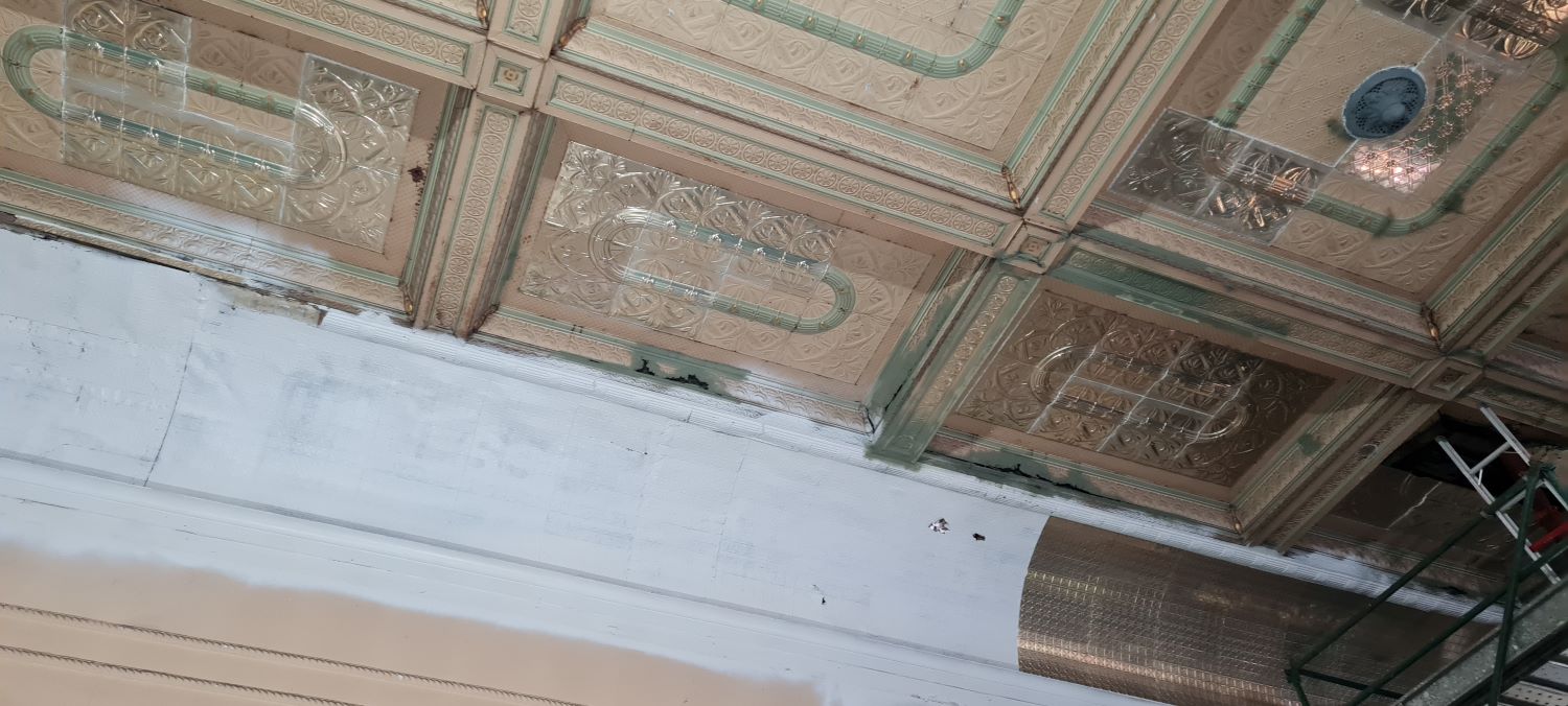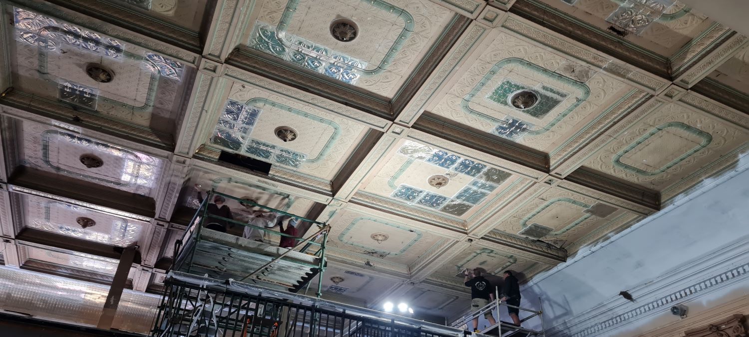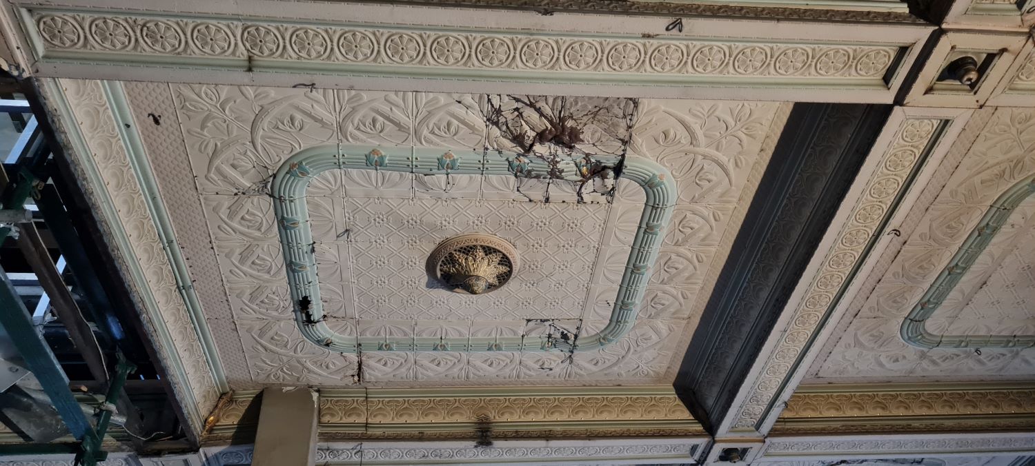 Scope of Contracting WorksRepair & restoration of original pressed metal ceiling & metal cornice. Two new dies were created to repair the decorative centre panels.