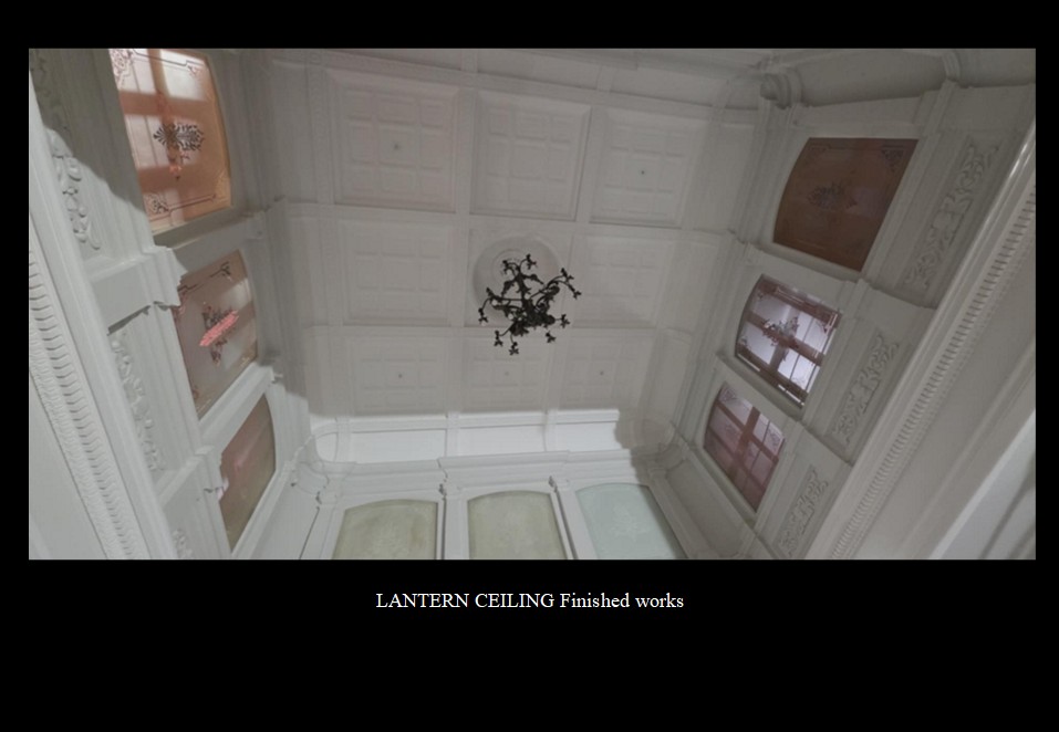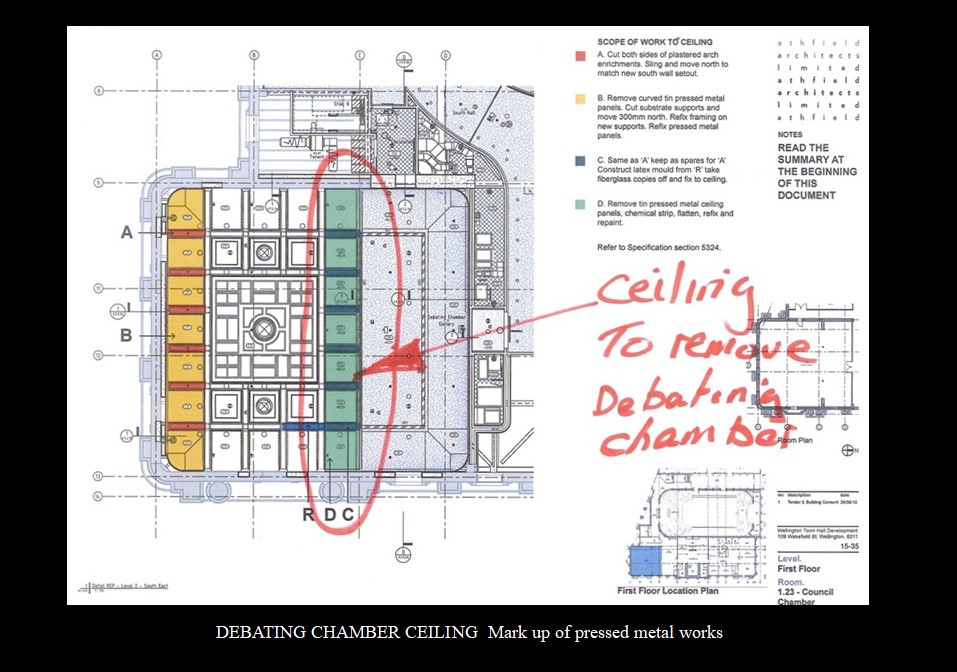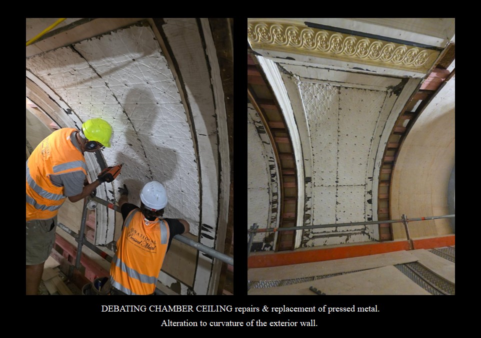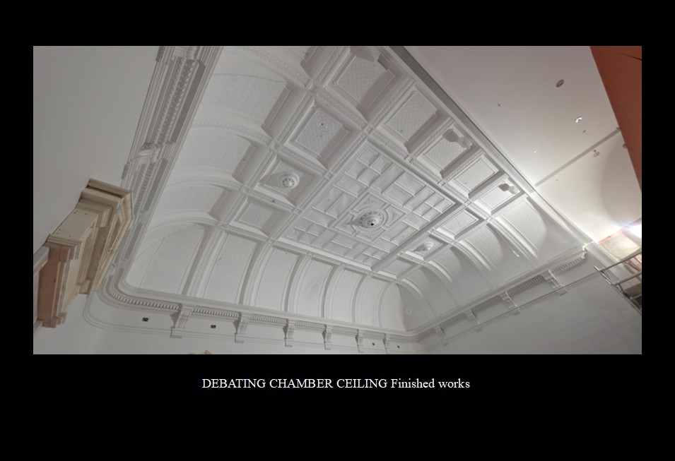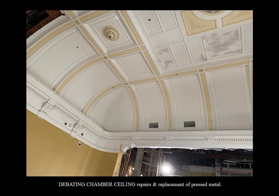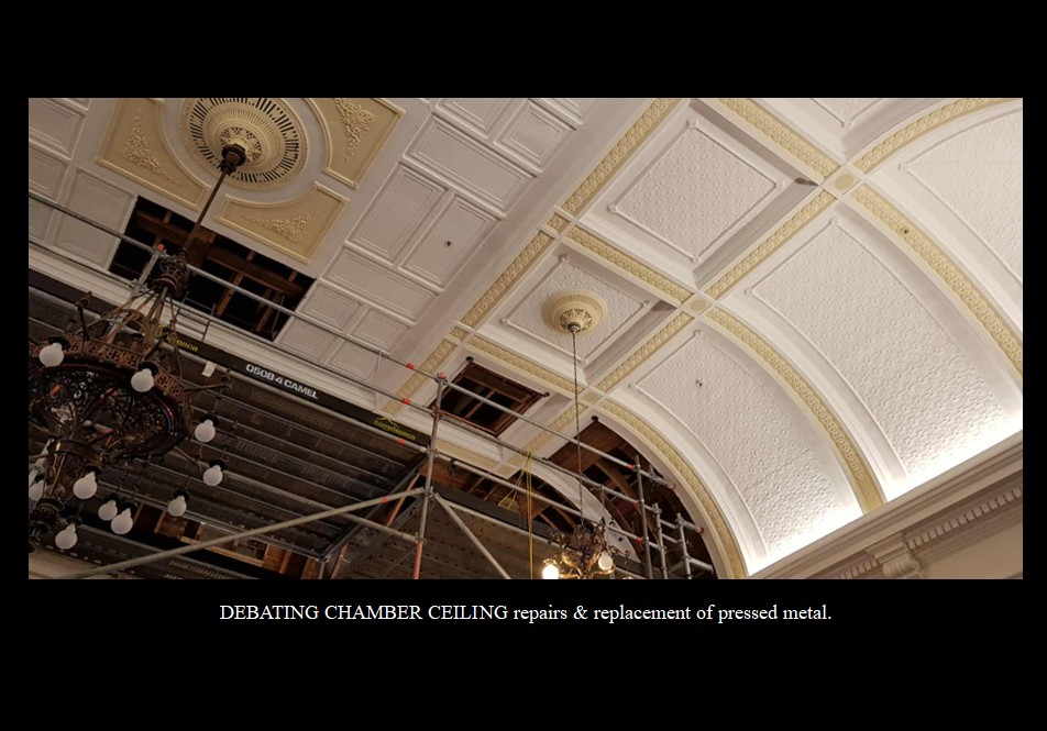 Scope of Contracting WorksDEBATING CHAMBER : Major seismic strengthening works required the construction of an 800mm-thick reinforced concrete wall, altering the Debating Chamber ceiling's curve radius. This necessitated complete removal & salvage of the original curved Fleur ceiling panels & Beam cladding. Reinstatement of the original Fleur panels & replacement panels required precise hand scribing to match the newly altered curvature. LANTERN CEILING: All original pressed metal panels were removed, cleaned, labelled & reinstated after replacement of rotted roof timbers & upgrades to mechanical & fire systems.