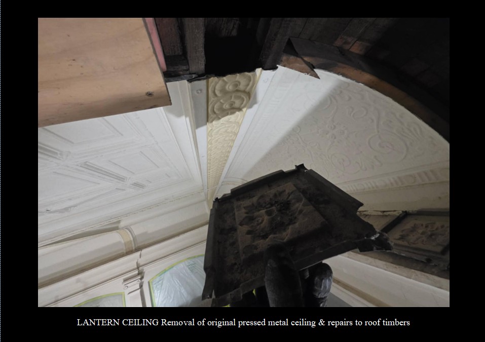 Project DescriptionDEBATING CHAMBER : Major structural works were needed in the Debating Chamber to stabilize the exterior wall for earthquake proofing. The stabilizing of the wall included reinforcing the wall with concrete up to 800mm thick which moved the wall into the existing footprint of the building, altering the substructure timber framing & ultimately changing the curve radius of the exterior wall while the internal side walls remained the same. Use of a mobile scaffold was required to unpick all of the original curved ceiling panels in the Fleur design. The Beam Cladding was also unpicked & removed to allow for fire service sprinklers to be installed. During the unpicking stage it was discovered that the Flower Boss & P Round Rail on the beams were replicated in lead, estimated to have been done in the 60's to replace the damaged Flower Boss & Rails. Due to the weight of these lead elements being a safety issue if they fell from heights, they were removed & reproduced in soft zinc before being reinstated. Damaged sections of the Beam Cladding were replaced using 6'' Beam Cladding from the Australian Pressed Metal catalogue. After being carefully unpicked, the original Fleur panels were chemically stripped & flattened prior to reinstallation. Approximately 30% of the original pressed metal panels were salvageable & the remainder of the panels were replaced with Imperial Fleur design panels to match in seamlessly with the original panels. Reinstatement of the original & Imperial Fleur panels involved meticulous attention to detail as the new curve radius needed to be carefully hand scribed to match the newly created ceiling curves. With the final coat of paint the restoration of the Debating Chamber ceiling was seamlessly restored to its original elegance. LANTERN CEILING : The scope of works of the Lantern area adjoining the Debating Chamber were of a smaller scale in comparison to other areas of the Wellington Town Hall. The original pressed metal panels were carefully removed, cleaned, labelled & stored for future reinstatement. Roof timbers were replaced due to wood rot & the updating of mechanicals & fire services was completed. After all structural works were completed, the original panels, which were 100% salvageable due to the skilful removal procedures, were expertly reinstated & the ceiling restored to its original splendour.