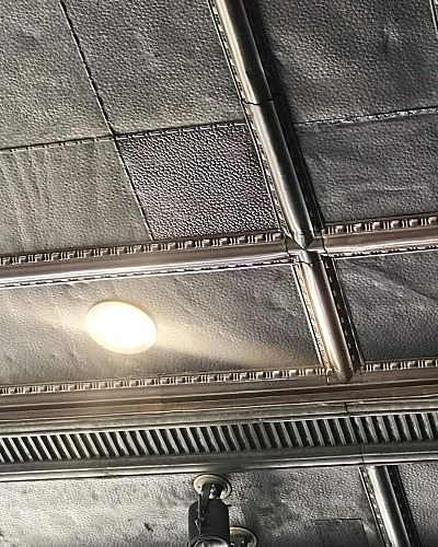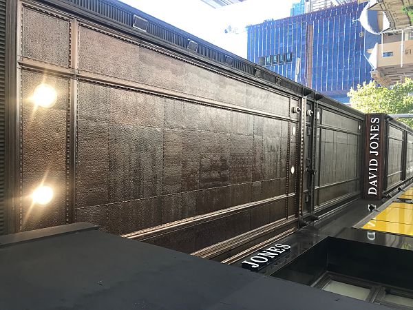 Sydney Pressed Metal worked with builder Mainbrace Constructions on the repair, restorations and additions to the copper soffit linings to the David Jones building in Sydney CBD. Work included reproduction of original design Gravelstone which was pressed in copper to exact imperial measurements to replace and repair damaged original panels and continuation of the pressed metal soffit. Each new copper panel was individually treated to age the copper panels matching the patina of the original material. The continuation of the copper soffit linings were finished using the Lambton Batten also pressed in copper and indiviually treated to age to match original. The Gravelstone panel was pressed on three sides with reel and bead edging to accomodate the original layout of the pattern and new was matched seamelssly with old. New moulds for the bell shaped finials that were situated in each corner section of the soffit were reproduced in copper requiring 4 pieces to recreate - 3 pieces for the skirt and one piece for the spire cap which was turned from solid copper. The pieces were then soldered together to form the complete element. The most challenging component for the Sydney Pressed Metal team was matching the copper patina to the original panels. This was completed to exacting standards and a seamless finish. Installing the pressed copper panels at night under low light conditions while challenging, was achieved professionally and to schedule.